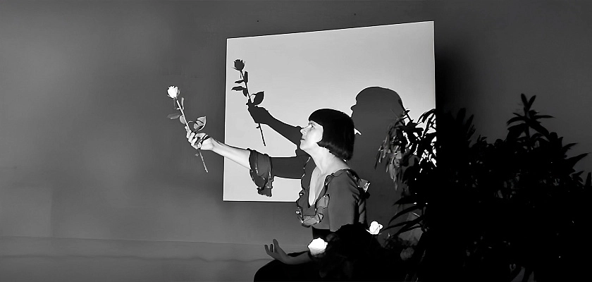 Тифлокомментарий: черно-белая фотография. На затемненной сцене вполоборота сидит Ирина Поволоцкая, одетая в блузку с глубоким декольте, с воланами на груди. У нее стрижка каре с прямой челкой, линия волос четко очерчена чуть выше плеч. Актриса держит в вытянутой руке белую розу на длинном стебле. На белом квадрате экрана позади нее видна контрастная тень ее профиля и тонкой руки с цветком. У ног Ирины стоят еще две розы, рядом — пышная растительность с ажурными листьями.