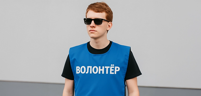 Тифлокомментарии Елены Керн: цветной фотопортрет. На сером фоне стоит стройный рыжеволосый юноша в темных очках. Он сосредоточен, его губы плотно сжаты. Парень одет в простую черную футболку и синий жилет с крупной надписью «Волонтер» на груди.