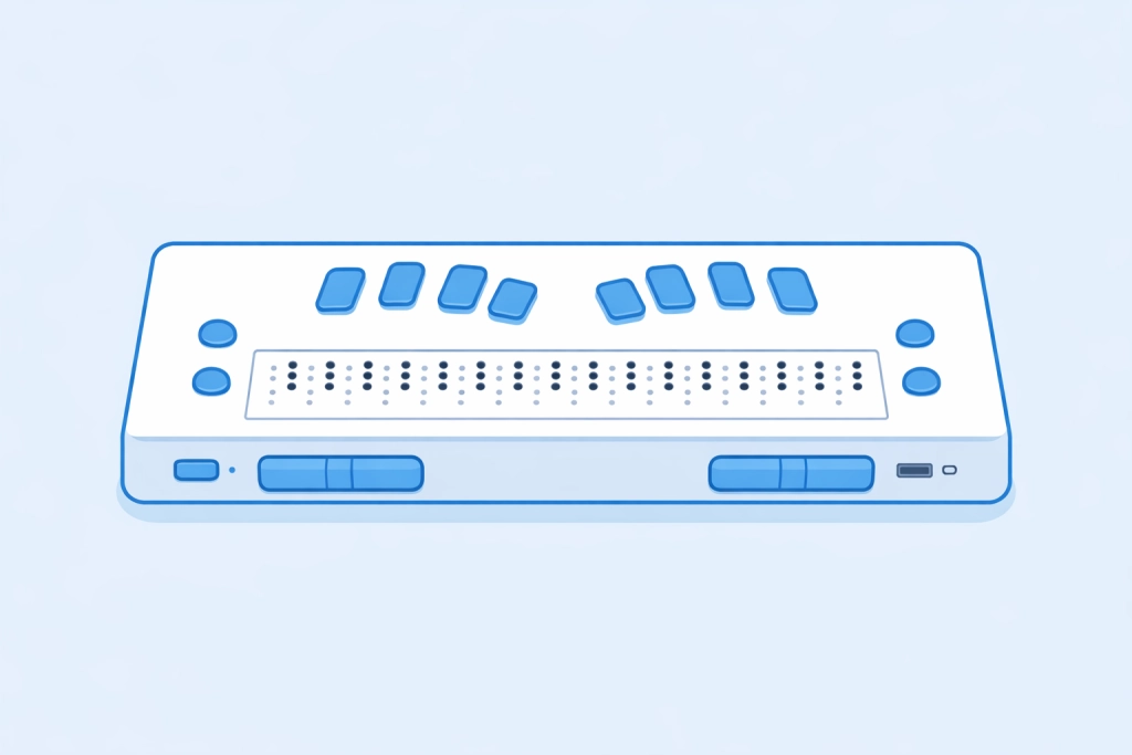 Дисплеем Брайля называют электромеханическое устройство вывода информации, которое подключается к компьютеру или смартфону и повторяет текст на экране рельефно-точечным шрифтом Брайля. Устройство представляет собой панель с кнопками управления и рядами ячеек Брайля с подвижными штифтами, которые при подъеме и образуют символ шрифта Брайля. Выделенный на экране текст дублируется шрифтом Брайля на дисплее в реальном времени.