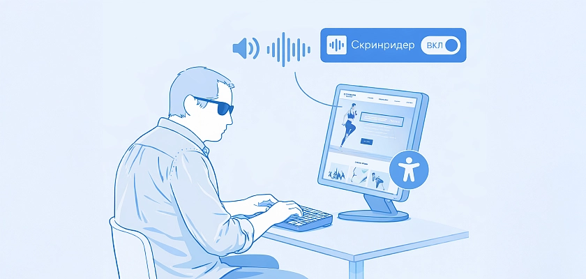 Тифлокомментарий: иллюстрация в бело-синих тонах. Молодой мужчина в темных очках и рубашке сидит за столом перед компьютером, обе руки держит на клавиатуре. На экране монитора открыта страница сайта со спортивными тренировками. По сторонам и над монитором хаотично расположены значки громкости, звуковой волны, белого человечка в синем круге и надпись «Скринридер. ВКЛ».