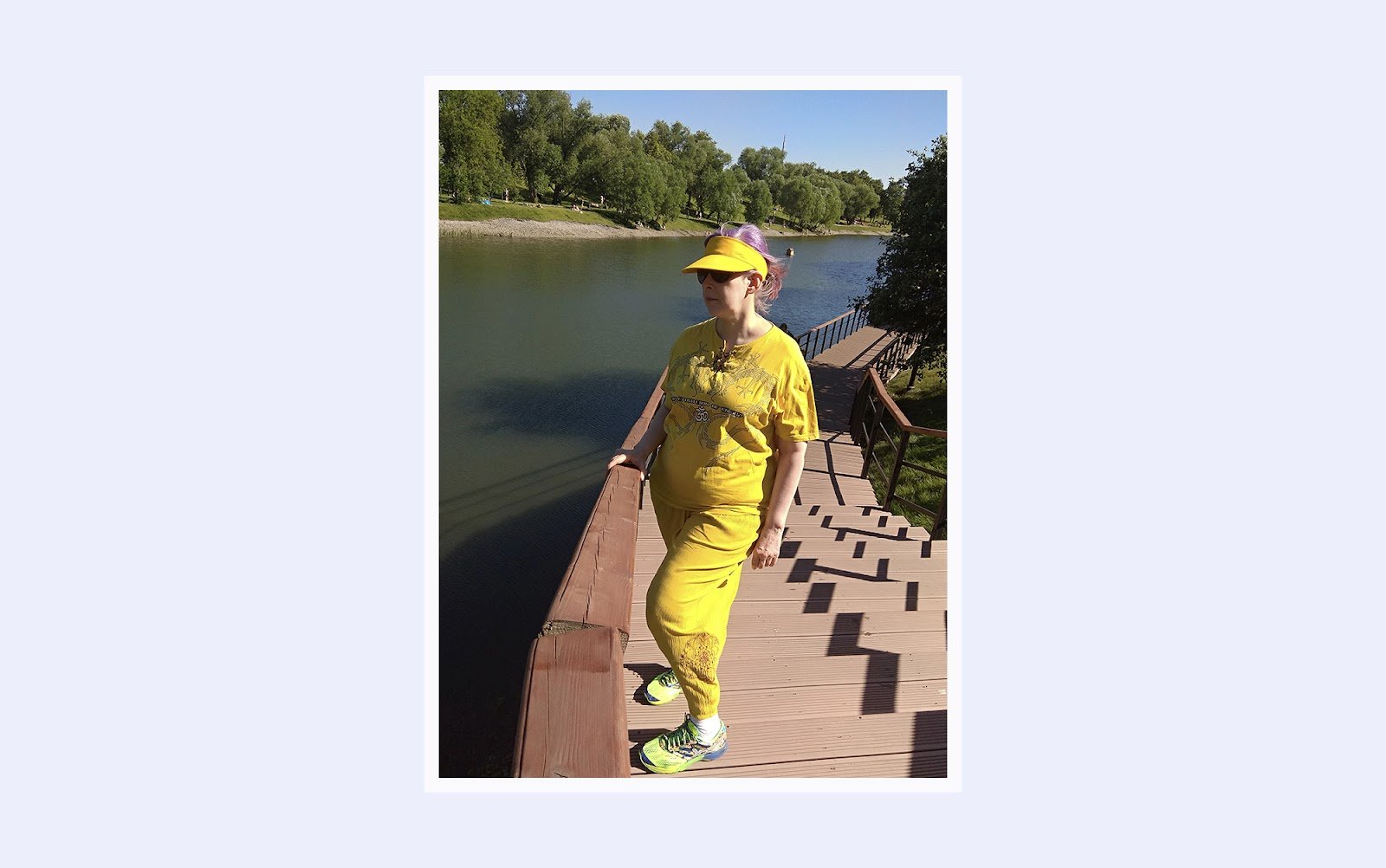 Тифлокомментарий: цветная фотография. Солнечный летний день. Ирина в черных очках стоит на деревянном настиле у водоема. На ней желтые футболка, штаны и кепка-козырек, яркие кроссовки. Светло-фиолетовые волосы развеваются на ветру.