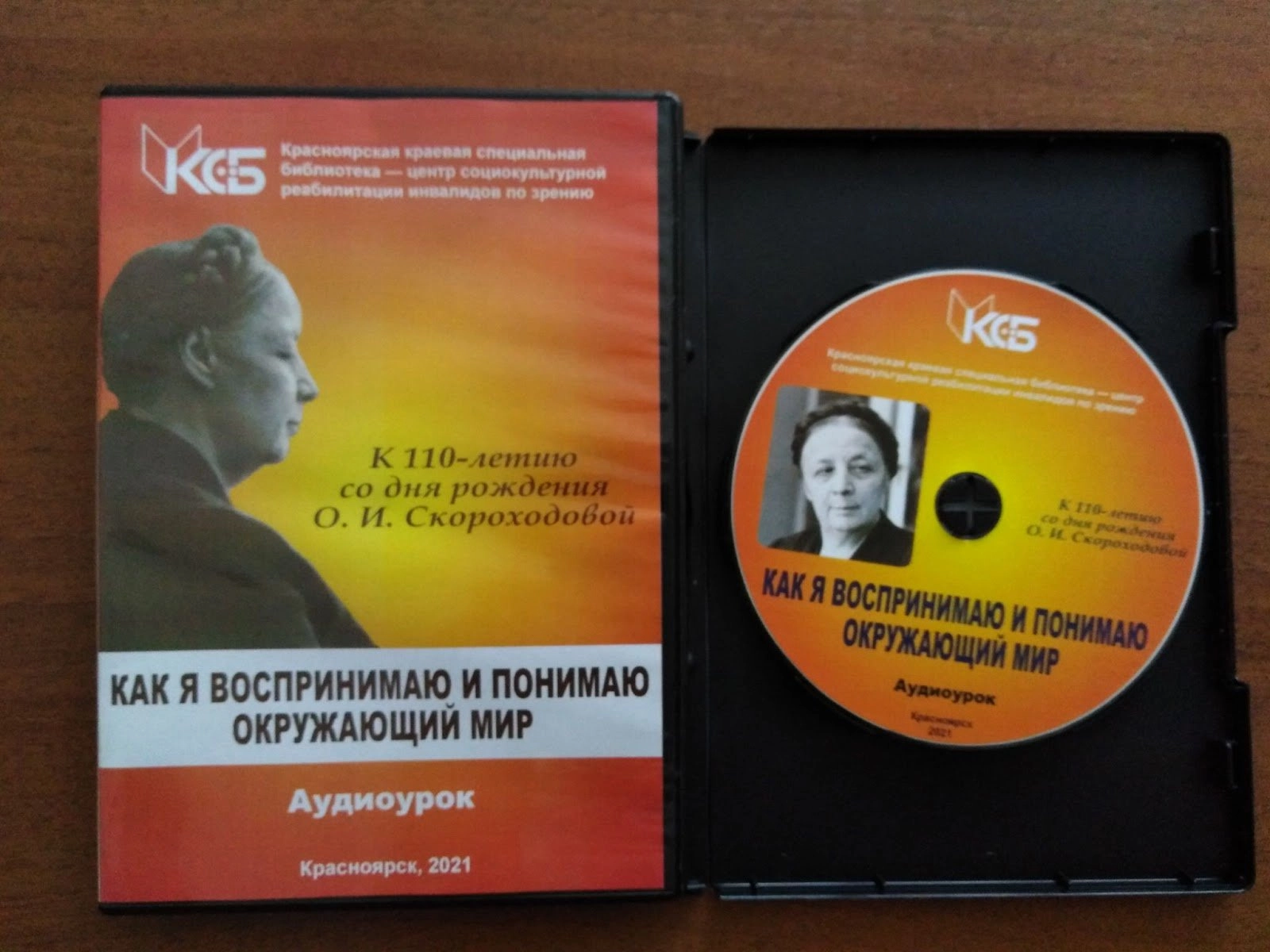 Тифлокомментарий: цветная фотография. На коричневом столе в черном пластиковом футляре лежит аудиодиск «Как я воспринимаю и понимаю окружающий мир». Аудиодиск и его обложка оранжевого цвета дополнены черно-белой фотографией пожилой женщины и текстом: «Красноярская краевая специальная библиотека — центр социокультурной реабилитации инвалидов по зрению», «К