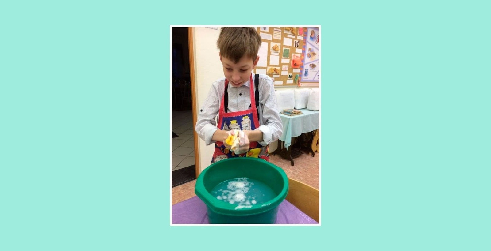 Тифлокомментарий: цветная фотография на зеленом фоне. Учебный класс со светлыми стенами. Темноволосый мальчик лет восьми что-то стирает в зеленом тазике, улыбается. На нем разноцветный фартук поверх белой рубашки с длинными рукавами.