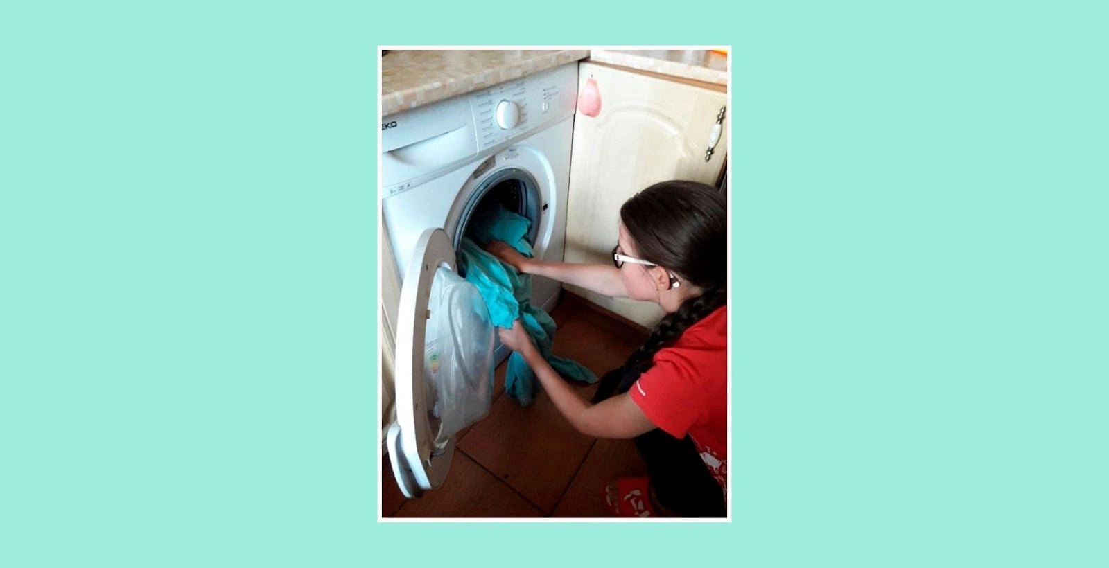 Тифлокомментарий: цветная фотография на зеленом фоне. Светлая кухня. Темноволосая девочка лет десяти в очках вынимает белье из стиральной машины.