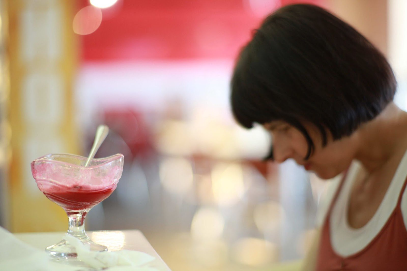 Тифлокомментарий: цветная фотография. Ирина сидит за столиком в кафе, склонив голову. У нее темное каре. На столике стоит креманка с сорбетом. Желтые огоньки и неоновые надписи на заднем фоне размыты.