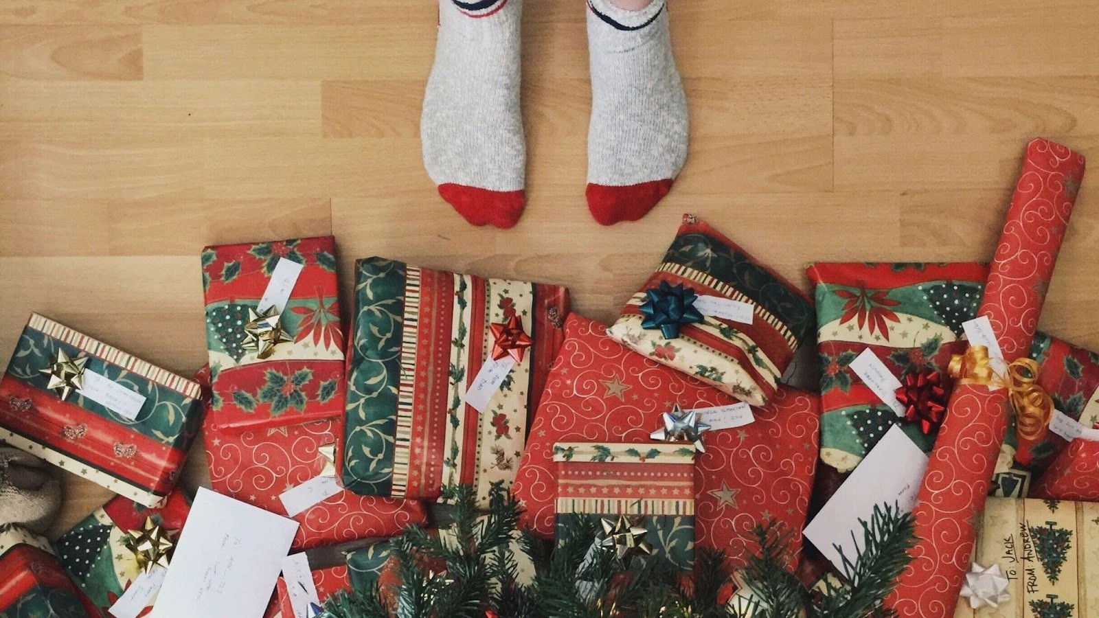Тифлокомментарий: цветная фотография. На светлом паркетном полу лежит груда подарков. Это коробки, свертки и пакеты разного размера, завернутые в одинаковую красно-зеленую бумагу с новогодними мотивами. У подарков кто-то стоит: видны только ноги в светлых носках.