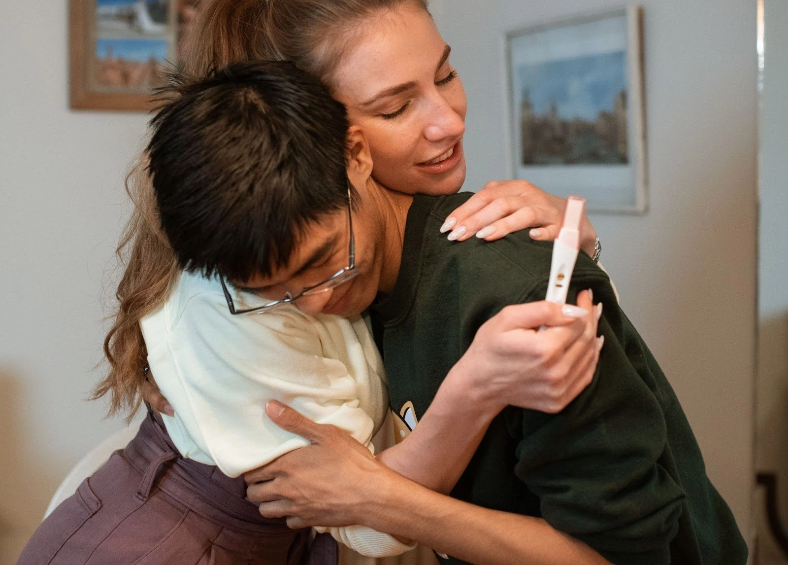 Тифлокомментарий: цветная фотография. Темноволосый юноша в очках и блондинка с длинными волосами, собранными в высокий хвост, бережно обнимают друг друга. Они улыбаются, их глаза закрыты. Девушка держит в руке продолговатый пластиковый футляр— экспресс-тест на беременность. Она одета в сиреневую юбку и белый свитшот, на юноше темная одежда. За парой на белой стене висят картины в рамах.