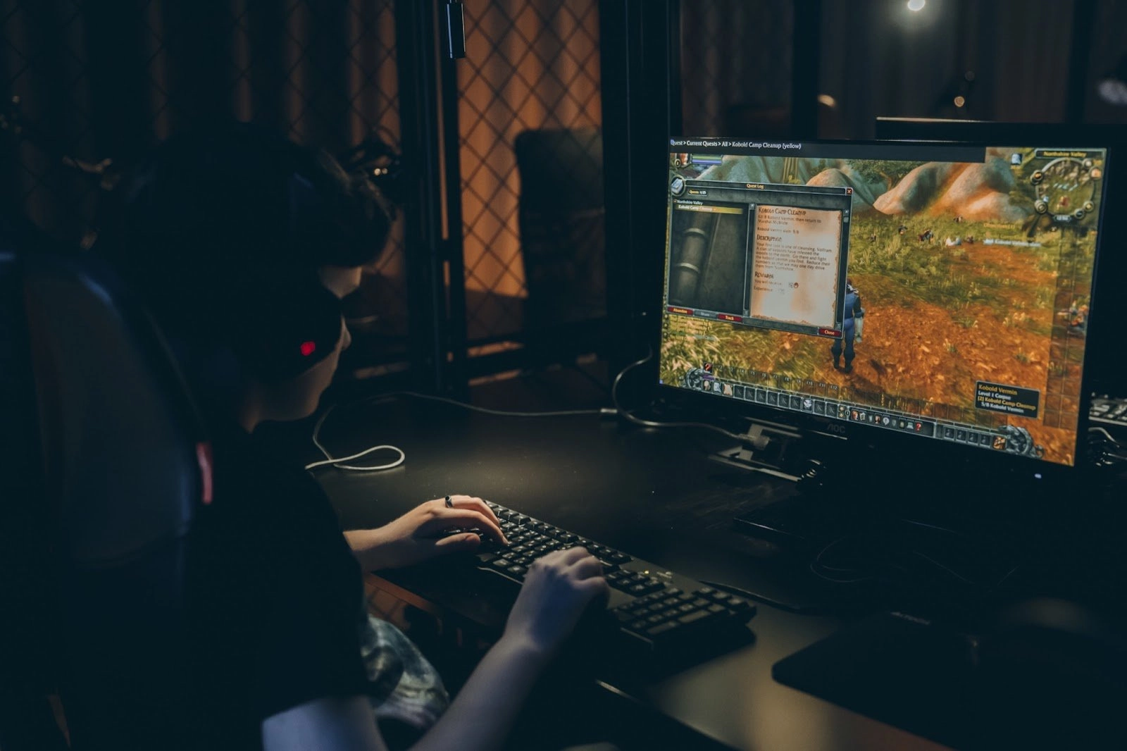 Тифлокомментарий: цветная фотография. Компьютерный клуб. Перед монитором сидит девушка в черных наушниках, ее руки лежат на клавиатуре. На экране компьютерная игра: на холмистой местности стоит персонаж, открыта вкладка с заданием.
