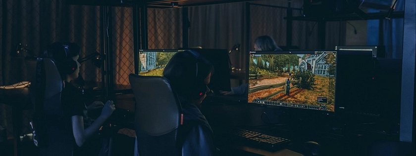 Тифлокомментарий: цветная фотография. Компьютерный клуб в полумраке. За центральным игровым столом лицом друг к другу сидят две девушки в массивных черных наушниках. Они увлечены игрой, с интересом смотрят на мониторы своих компьютеров. Из-за спины одной из них за ходом игры наблюдает молодой человек в светлой толстовке.