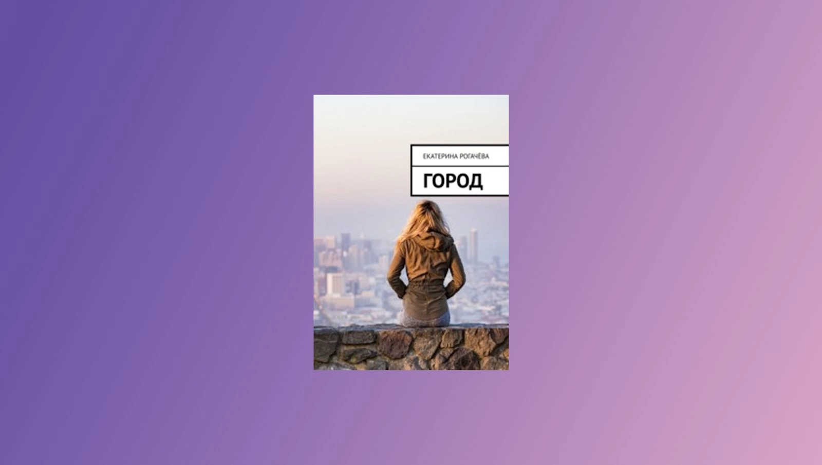 Тифлокомментарий: цветной коллаж. На обложке — фото светловолосой девушки в коричневой куртке. Она сидит спиной к нам на каменном парапете, смотрит на мегаполис, погруженный в утреннюю дымку. Вверху справа — белый прямоугольник с черными надписями: «Екатерина Рогачева» и «Город».