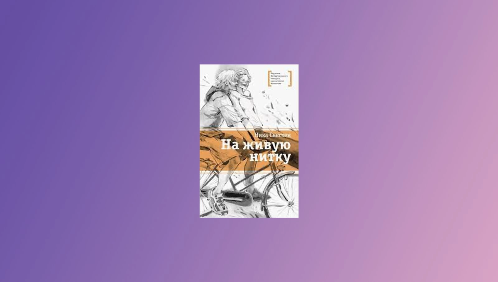 Тифлокомментарий: цветной коллаж. На белой обложке черно-белый рисунок. Мальчик и девочка в шортах и спортивных кофтах мчатся на велосипеде по цветочному полю, широко улыбаются. Мальчик сидит на седле, девочка спиной к нему на раме. На широкой оранжевой полосе в середине две белые надписи: «Ника Свестен» и «На живую нитку».