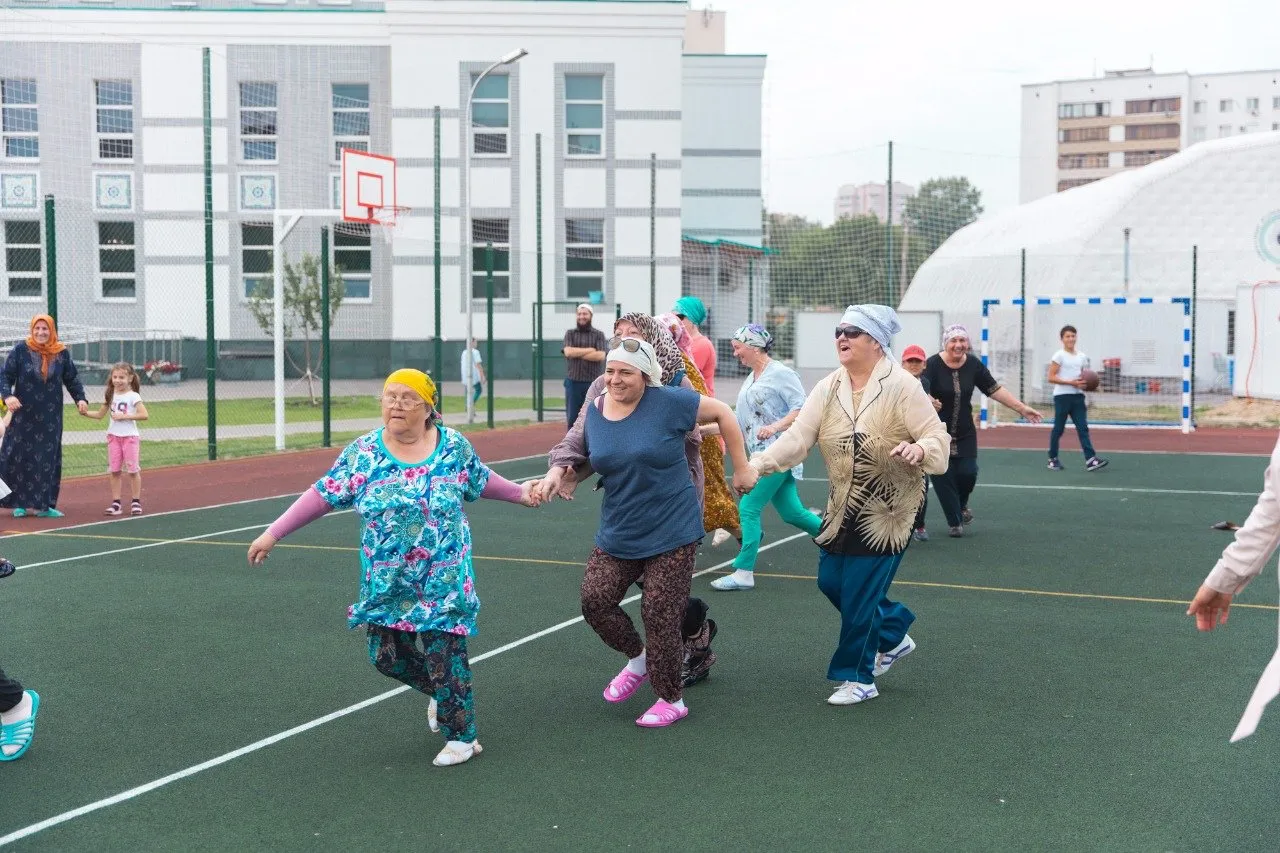 Тифлокомментарий: цветная фотография. На универсальной спортивной площадке центра «Ярдам» многолюдно, идут соревнования. Несколько женщин среднего возраста бегут в группах по трое, взявшись за руки, смеются. Некоторые из них в темных очках. Площадка огорожена сеткой и оборудована воротами для мини-футбола и баскетбольными стойками.