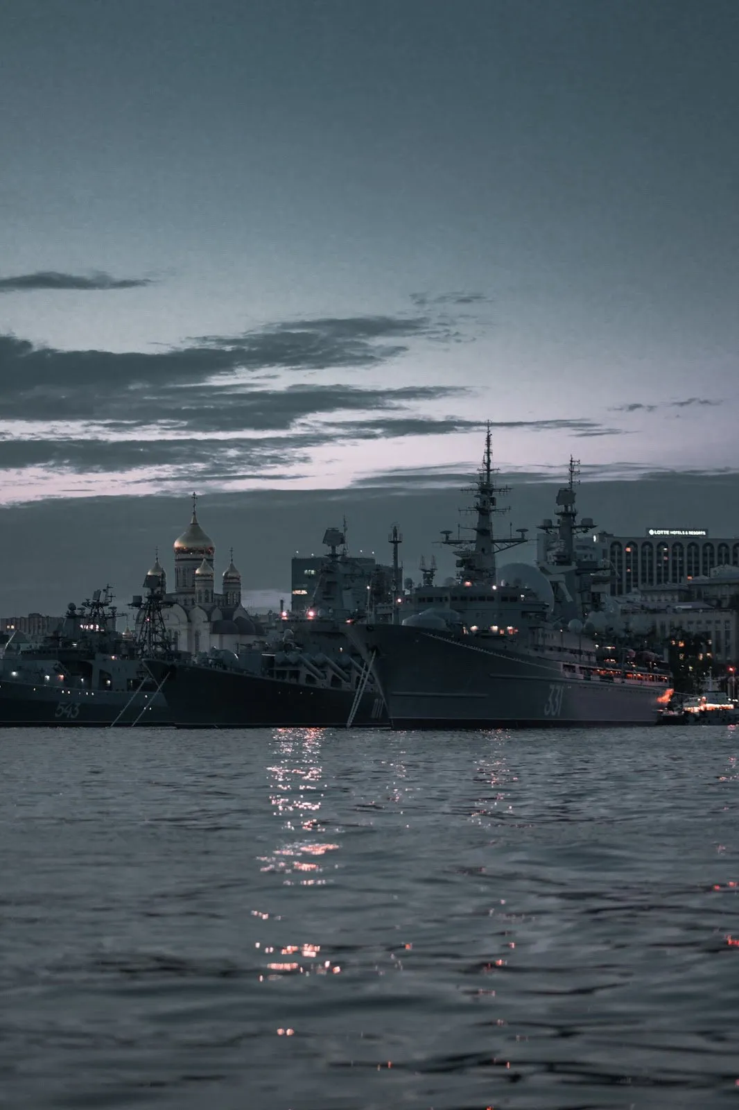 Тифлокомментарий: цветная фотография. Вечерние сумерки. Низкие серые облака сгущаются над побережьем и центральной площадью Владивостока. У набережной пришвартованы три военных корабля. За ними виднеется белокаменный Спасо-Преображенский кафедральный собор. Он построен в русско-византийском стиле с пятью золотыми куполами-луковицами.