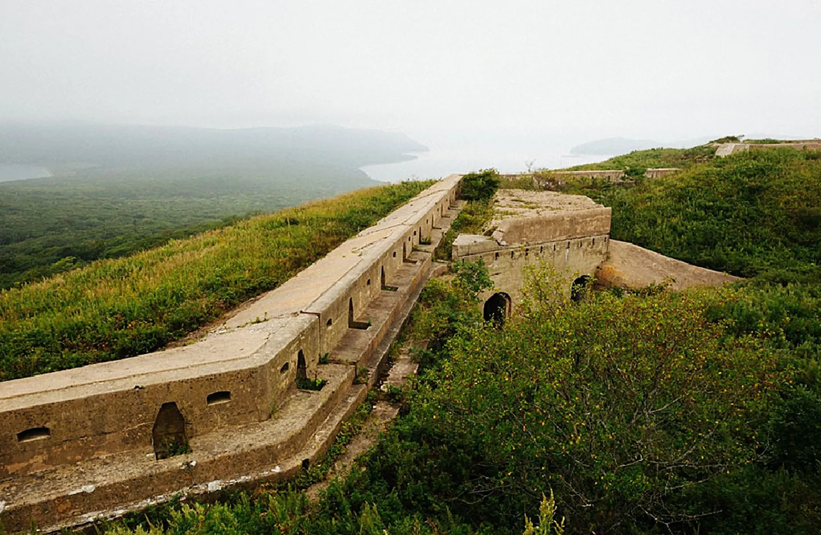 Тифлокомментарий: цветная фотография. По извилистому хребту зеленого холма тянутся руины крепостной стены с бойницами. С вершины открывается вид на залив, окутанный туманом.