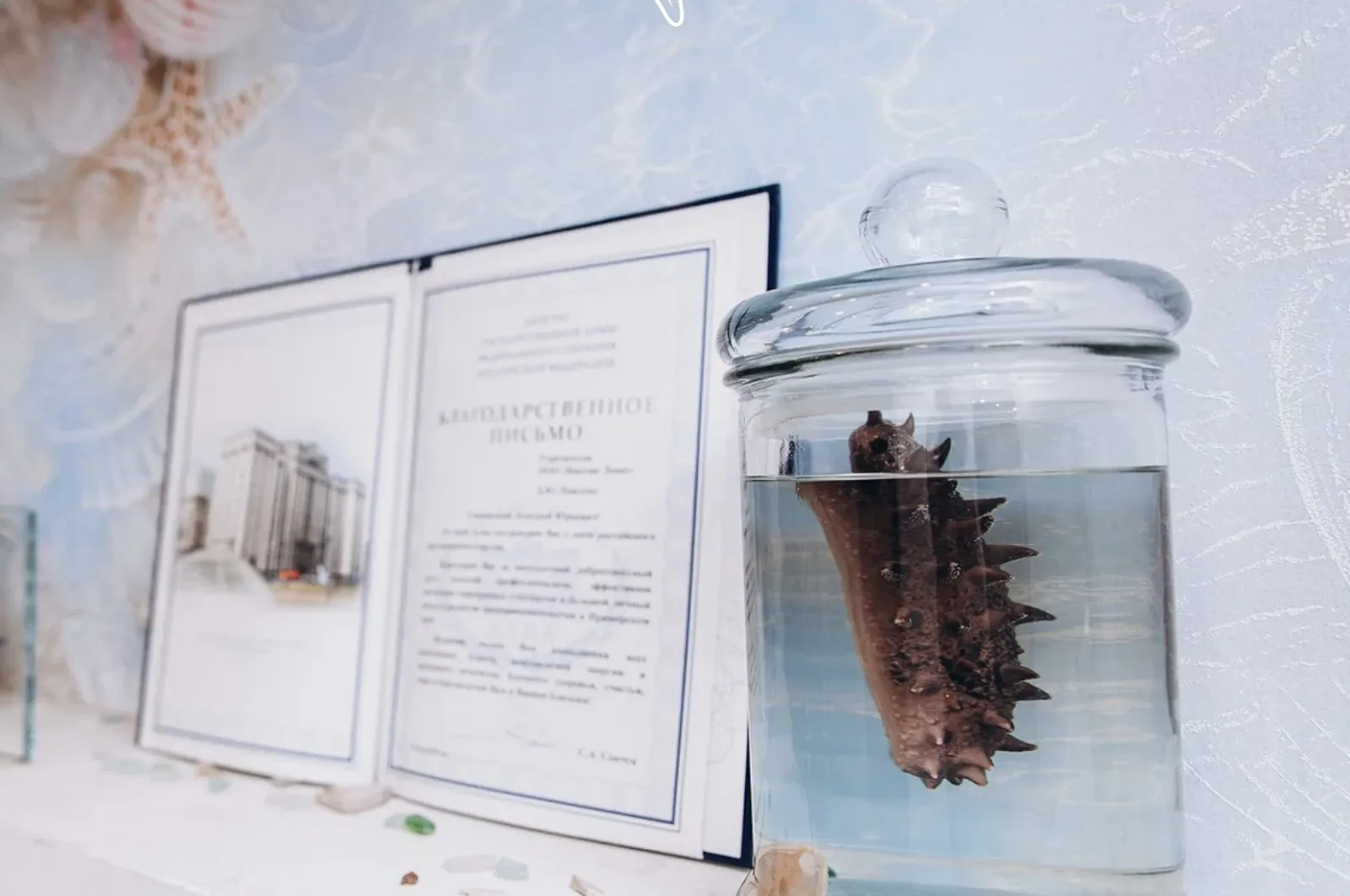 Тифлокомментарий: цветная фотография. У голубой стены на белой поверхности стоят раскрытая папка с благодарственным письмом и стеклянный сосуд с прозрачной жидкостью. В нем плавает трепанг. Это беспозвоночное морское животное, размером с ладонь. Он похож на коричневый огурец, покрытый наростами в виде шипов.