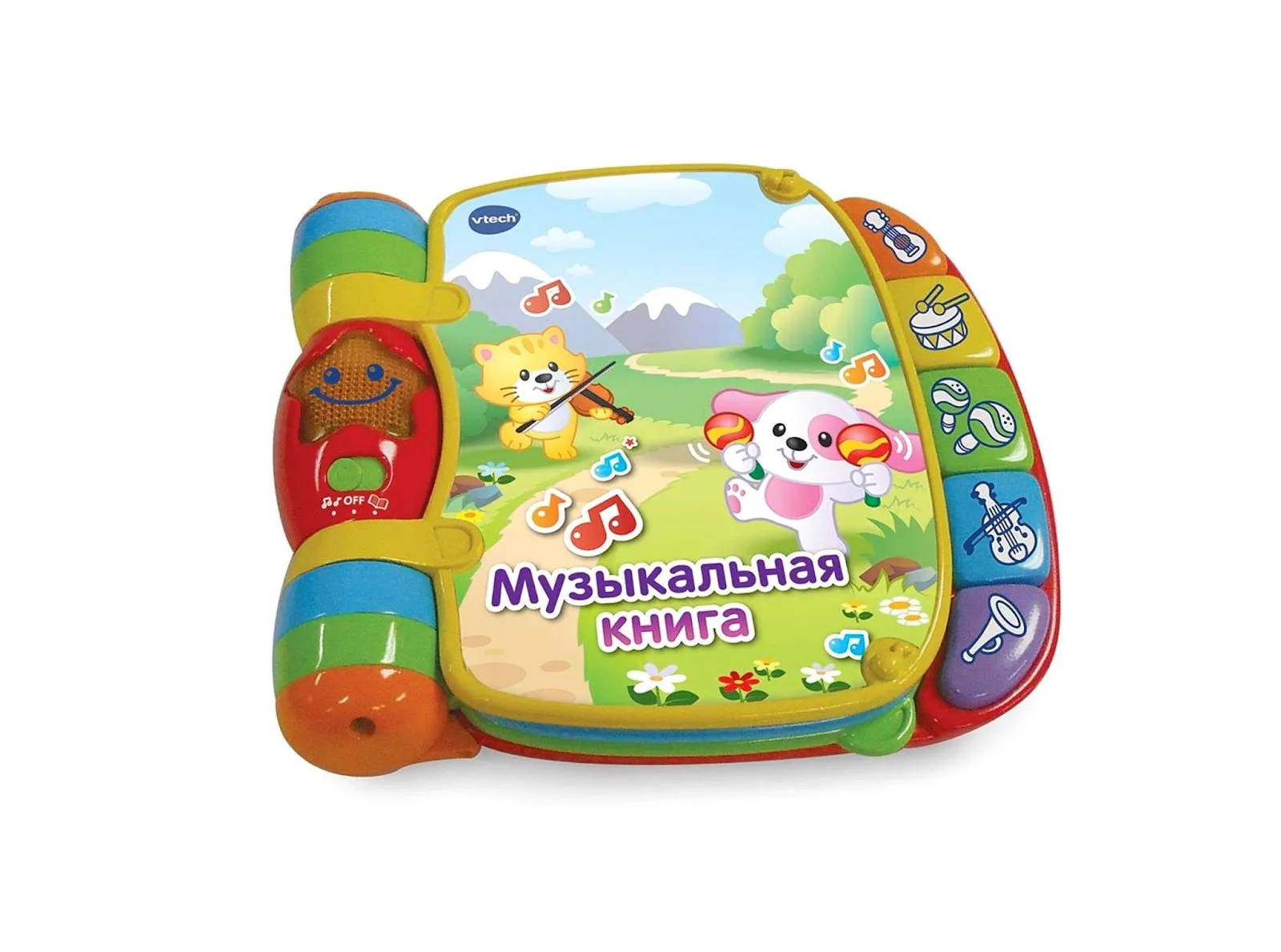 Тифлокомментарий: цветная фотография. Пластиковая развивающая игрушка «Музыкальная книга». Ее страницы закреплены на разноцветном цилиндрическом переплете. На титульном листе нарисованы котенок и щенок, играющие на скрипке и маракасах. Справа сверху вниз расположены объемные кнопки с изображением музыкальных инструментов.