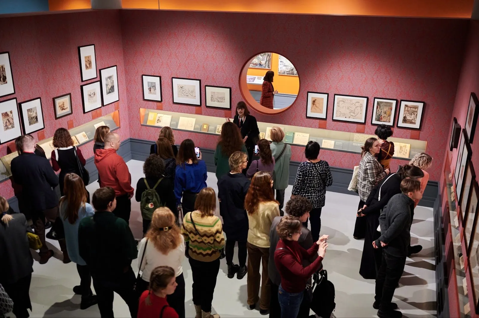 Тифлокомментарий: цветная фотография. Выставочный зал с красными стенами заполнен посетителями. Надежда проводит экскурсию. На стенах висят небольшие разноцветные картины в белых паспарту и узких черных рамах. В центре одной из стен — круглое отверстие, диаметром примерно один метр. Через него виден другой выставочный зал с оранжевыми стенами.