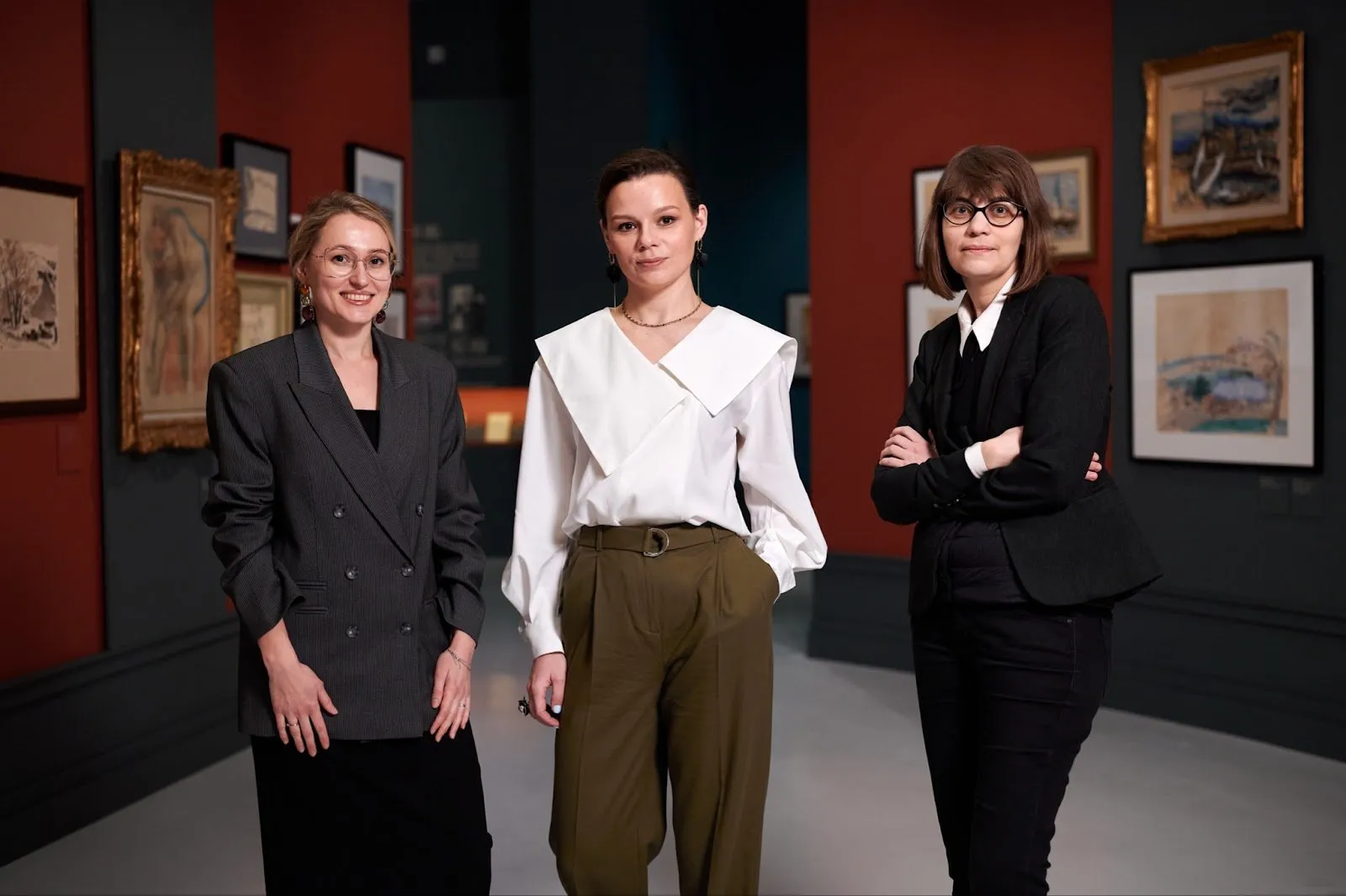 Тифлокомментарий: цветная фотография. Ксения, Юлия и Надежда в уже знакомых нам одеждах стоят в ряд в выставочном зале с красными стенами, улыбаются.