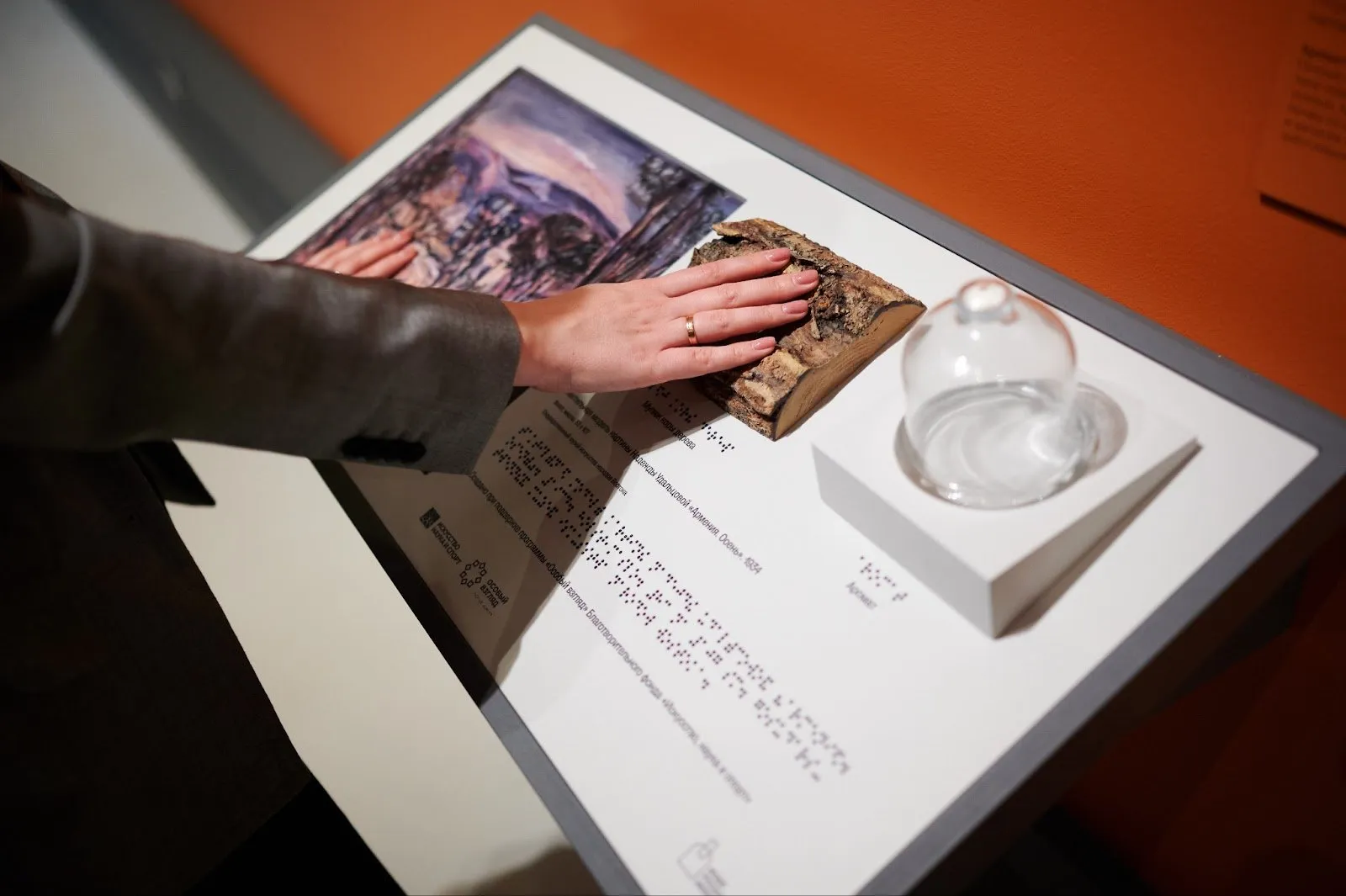 Тифлокомментарий: цветная фотография. Молодая женщина в коричневом пиджаке руками изучает тактильную станцию к картине Надежды Удальцовой «Армения. Осень». Это белая наклонная панель, прикрепленная к красной стене. На станции слева направо расположены рельефная цветная копия картины, горбыль — боковая часть ствола дерева и стеклянный клош обтекаемой формы. Под каждым предметом — черные надписи, дублированные шрифтом Брайля.