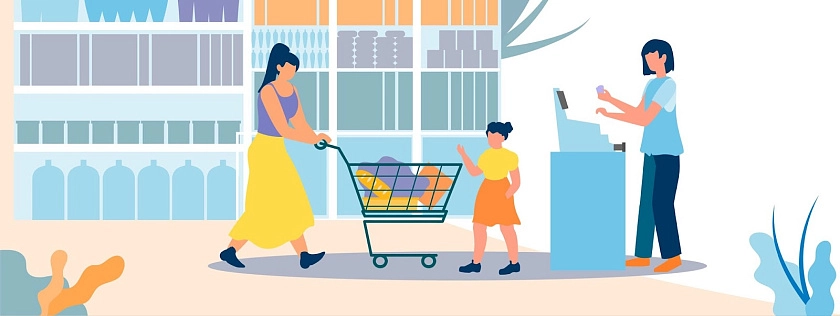 — Когда вы с помощником выбрали все, что необходимо, вы идете на кассу. Перед кассой в супермаркете есть специальная движущаяся лента, на нее выкладывают товар, он двигается на ленте по направлению к кассиру. Чтобы кассир знала, где заканчивается товар одного покупателя и начинается следующего, товар разделяют специальным разграничителем, который похож на палку. Продавец берет товар по одному и сканирует, в этот момент слышен своеобразный звук. Дальше продавец кладет товар на специальную тумбу, где его упаковывают в пакеты или сумки. Пока сканируют товар, нужно определиться со способом оплаты, будешь платить наличными деньгами или выберешь безналичный способ оплаты (карточка, QR-код). Во время покупок можно пользоваться калькулятором или считать в уме, на какую сумму выходят покупки, чтобы быть уверенной, что хватит денег рассчитаться. Если вдруг оказалось, что денег не хватает, то можно попросить продавца отменить товар, на который не хватает денег. Наличные деньги лучше заранее разобрать по номиналу, чтобы на кассе было проще и быстрее оплатить покупки. Можно разложить деньги по разным карманам кошелька, сложить их по-разному. Если оплата будет осуществляться карточкой, ее нужно приготовить заранее, пока сканируют товар, чтобы не задерживать очередь.