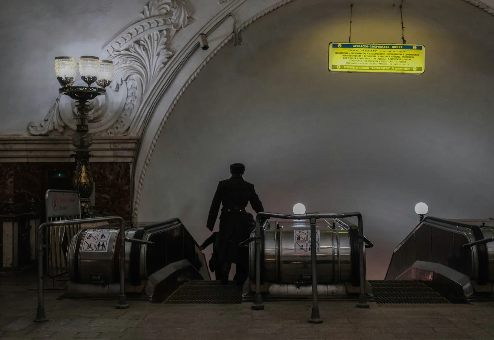 Тифлокомментарий: цветная фотография. Вестибюль станции метро «Арбатская». Под полукруглым сводом белоснежной арки, украшенной лепниной, расположены два эскалатора. На одном из них мужские фигуры. Над эскалаторами висит световой указатель со списком станций.