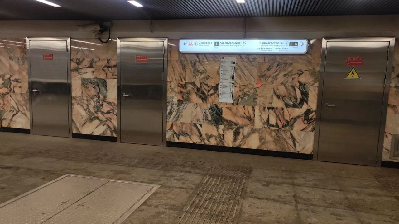 Тифлокомментарий: цветная фотография. Ярко-освещенный подземный переход к станции метро «Хорошевская». Соответствующие световые указатели расположены на цветной мраморной стене, между металлическими дверями технических помещений. На полу лежит тактильная плитка с рельефной поверхностью.