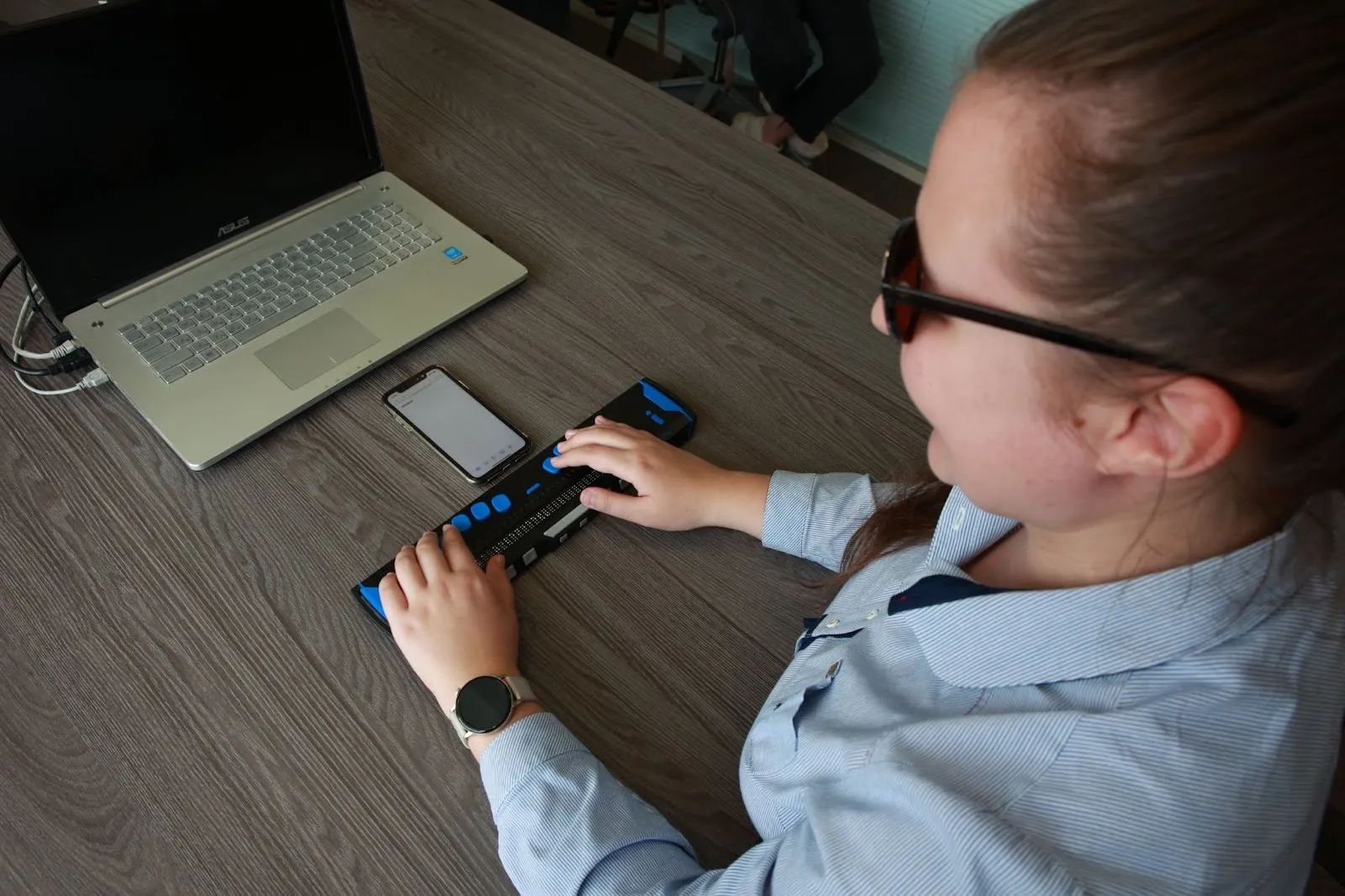 Тифлокомментарий: цветная фотография. Та же девушка сидит за тем же столом, держит руки на брайлевском дисплее. Перед ней на столе, за дисплеем, лежат смартфон и открытый серебристый ноутбук. На левом запястье девушки — смарт-часы с круглым циферблатом и светло-серым ремешком.