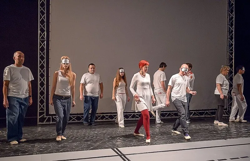 Тифлокомментарий: цветная фотография. По ярко освещенной сцене хаотично ходят десять человек. Это мужчины и женщины разных возрастов в белых майках и футболках, джинсах и белых штанах. У некоторых из них на глазах белые маски для сна. В середине — Ирина Поволоцкая. На ней приталенное платье из простой белой ткани с длинными рукавами и пышной юбкой до середины бедра, красные колготки и белые балетки. У нее короткие красные волосы.