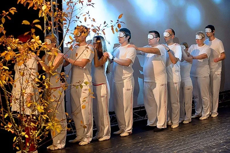 Тифлокомментарий: цветная фотография. На той же сцене десять человек, мужчины и женщины разных возрастов, стоят в ряд друг за другом, держат руки на плечах впереди стоящих. Во главе стоит Ирина в уже знакомом нам наряде, на остальных — белые футболки, белые свободные спортивные брюки и белые балетки. На глазах белые маски для сна. Перед ними стоит молодое дерево с желтыми листьями на тонких ветвях. Позади них — белое полотно с вспышками белого света.