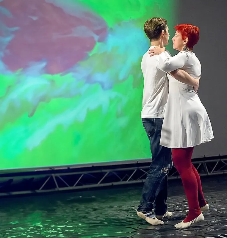 Тифлокомментарий: цветная фотография. Ирина в том же наряде в паре с молодым стройным брюнетом кружится в вальсе на ярко освещенной сцене. На ее партнере белая футболка, рваные на коленках джинсы и белые балетки. За ними — белое полотно, натянутое на большую металлическую раму. На полотне всполохи зеленого, красного и голубого цветов, похожие на разводы акварельной краски.