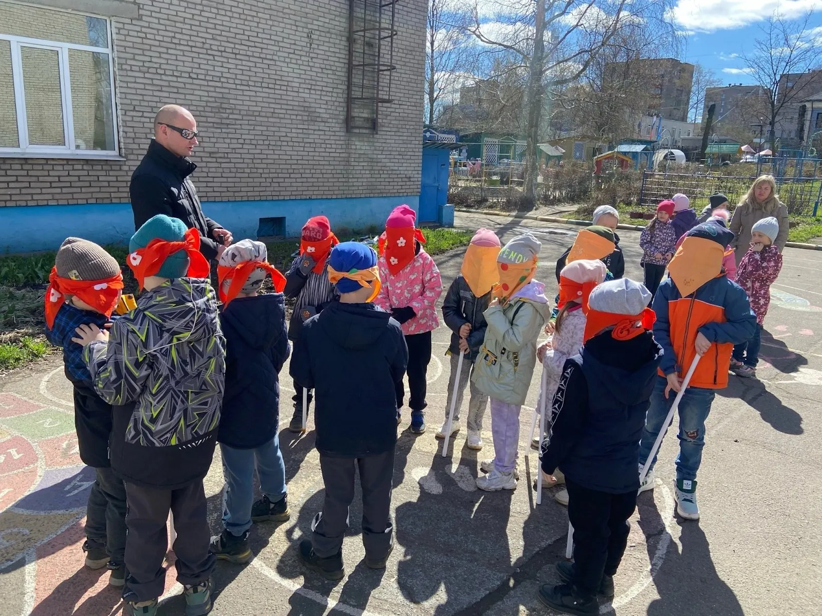 Тифлокомментарий: цветная фотография. Солнечный весенний день. Николай Пепень проводит экскурсию в детском саду. Группа дошколят в демисезонной одежде с белыми тростями в руках окружила экскурсовода. Ребята поправляют цветные повязки, закрывающие глаза.