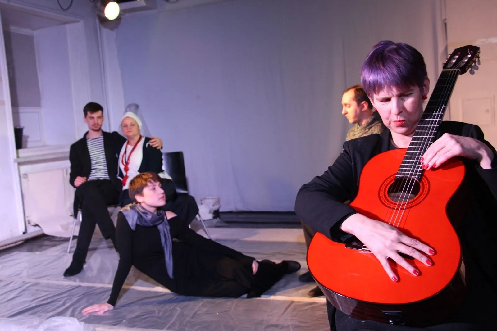 Тифлокомментарий: цветная фотография. Репетиционный зал с приглушенным светом. Стены и пол покрыты полиэтиленовой пленкой. Пять человек разыгрывают сцену из спектакля «Чайка. Фрагменты». Среди них — Ирина, с короткими фиолетовыми волосами, в черном пиджаке. Она сидит на стуле, держит на коленях ярко-красную гитару как виолончель, с грифом на плече, пальцами прикасается к струнам. На губах — красная помада, на ногтях — красный лак.