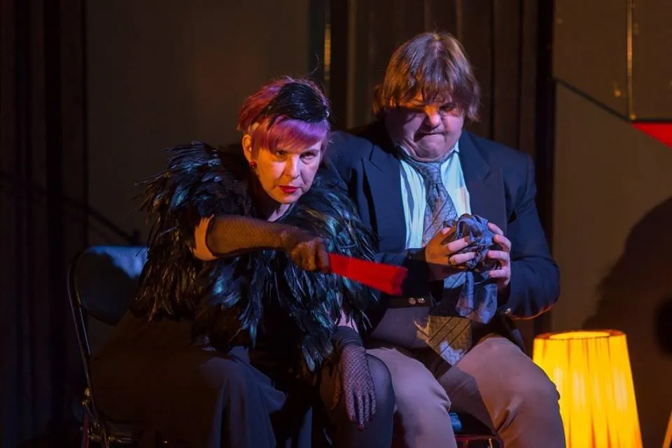 Тифлокомментарий: цветная фотография. Сцена из спектакля «Чайка. Фрагменты». Перед черными шторами Ирина и полный молодой человек в уже знакомых нам образах. Они так же сидят бок о бок на стульях. Ирина, чуть наклонившись вперед, властно показывает вперед сложенным веером. Мужчина руками сжимает в комок кусок материи, тужится от усилия. У его ног стоит фонарь с теплым желтым светом.