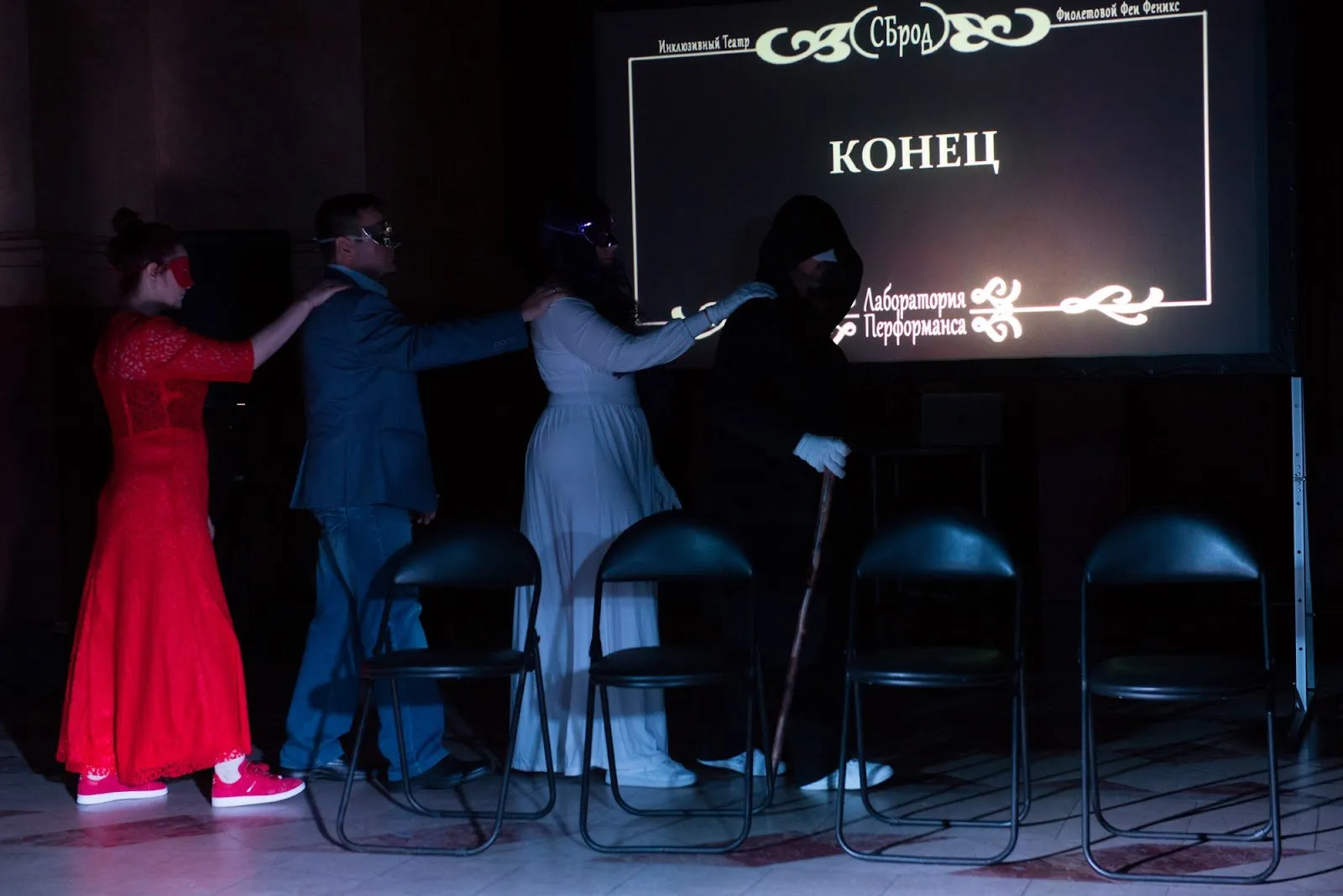 Тифлокомментарий: цветная фотография. На сцене полумрак. Друг за другом, положив руку на плечо впереди идущего, движутся четверо актеров спектакля. Колонну возглавляет персонаж, одетый во все черное, с клюкой в руке. За ним — женщины в вечерних платьях и мужчина. Они идут между рядом стульев и экраном с надписью: «Конец».