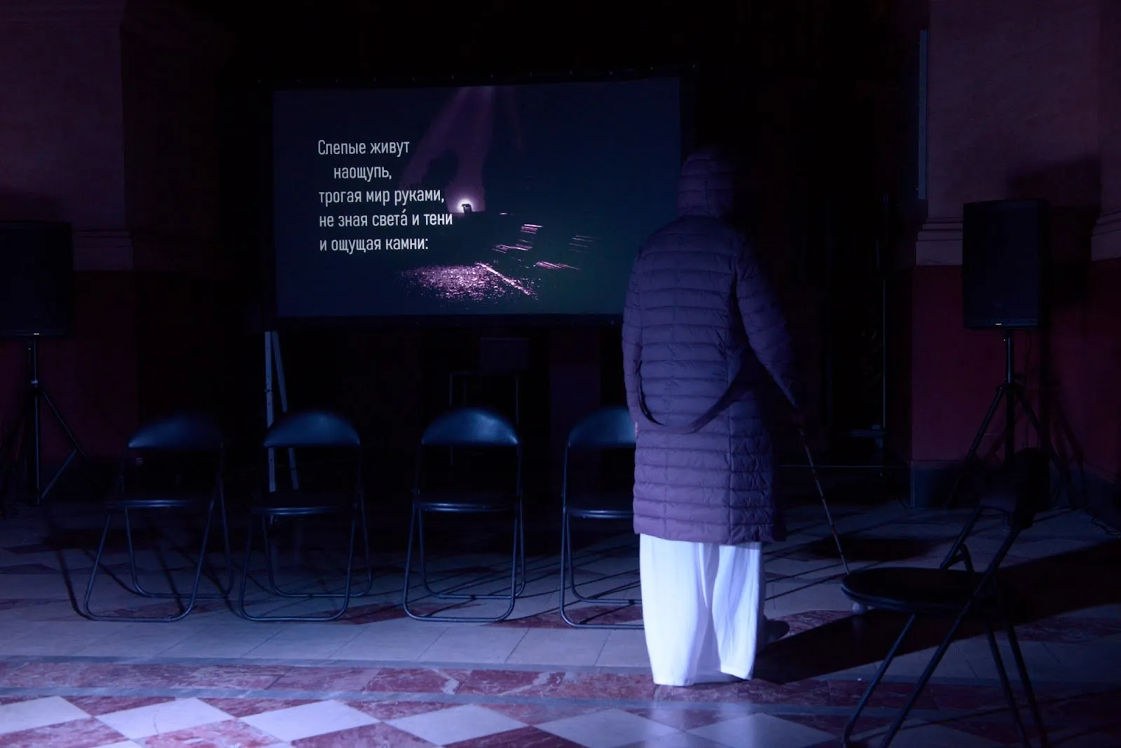Тифлокомментарий: цветная фотография. На сцене полумрак. Перед экраном, спиной к нам, стоит женщина в длинном белом платье и черном стеганом пуховике. На экране — строки из стихотворения Иосифа Бродского.