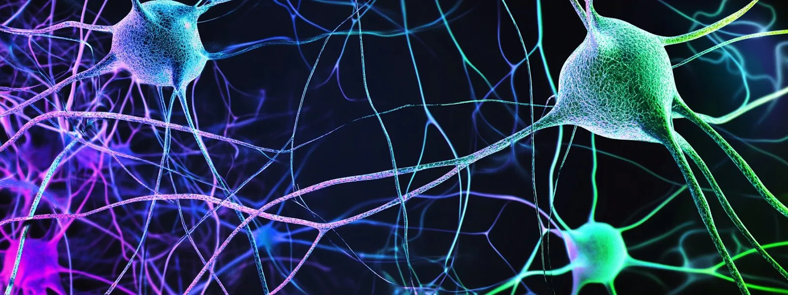 Тифлокомментарий: цветное изображение нейронной сети с сине-зеленых неоновых тонах. Нейронные клетки звездчатой формы соединяются между собой тонкими нитями.