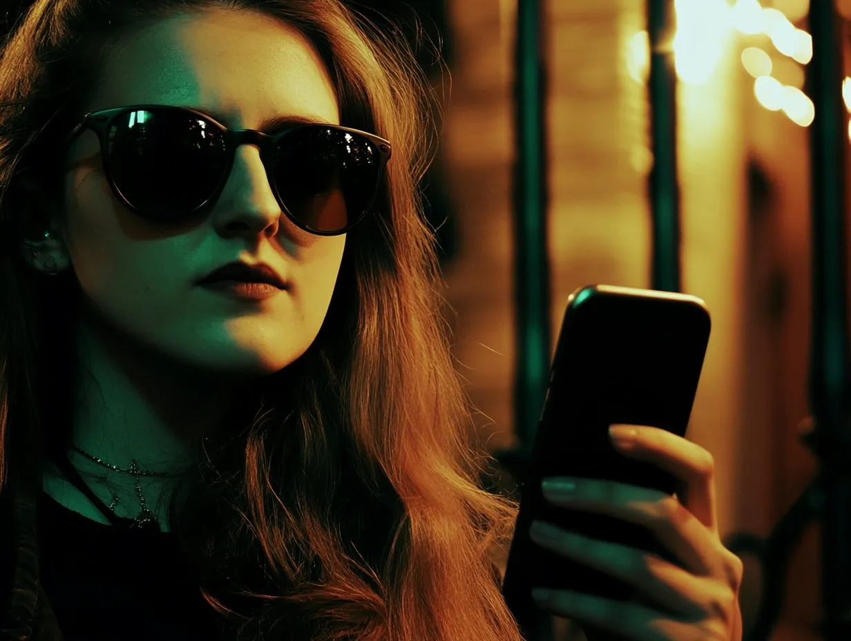 Тифлокомментарий: цветная фотография. Девушка с длинными русыми волосами стоит у панорамного окна в свете уличного фонаря, держит перед собой смартфон. На ней — крупные черные очки и темная кофта.