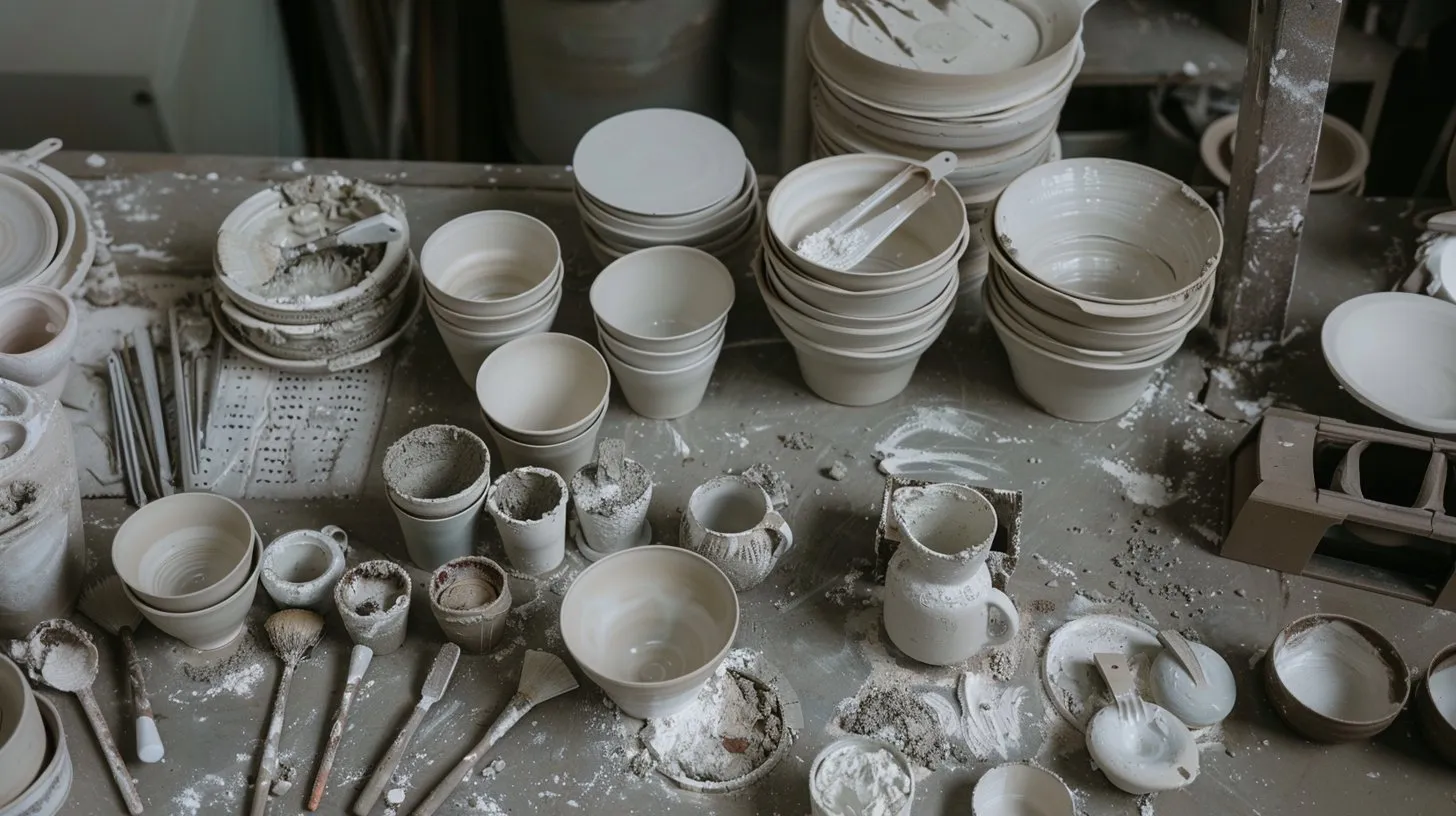 Тифлокомментарий: цветная фотография. На серой горизонтальной поверхности, измазанной глиной, стоят чаши с белой глазурью, стопки глиняных горшков и лежат инструменты: гребешки, скребки, кисточки.