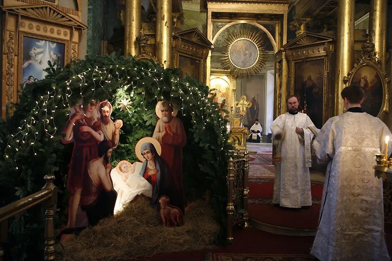 Тифлокомментарий: цветная фотография. Священники и дьяконы в белых облачениях проводят богослужение в православном храме свт. Мартина Исповедника в Алексеевской слободе, щедро украшенном позолотой. Слева от открытых Царских врат стоит рождественский вертеп в виде полукруга из еловых ветвей, украшенного желтыми гирляндами. В вертепе под золотистой восьмиконечной звездой на сене установлены плоские фигуры в натуральную величину Святого Семейства и пастухов с овечками.