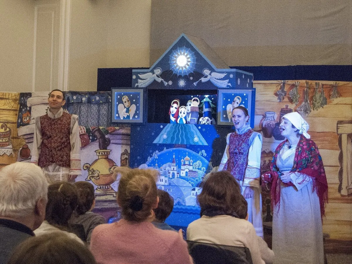 Тифлокомментарий: цветная фотография. В ярко освещенном зале с бежевыми стенами проходит рождественское представление. Три молодых актера — мужчина и две женщины в серо-красных русских народных костюмах — стоят в нарисованной избе с печкой и самоваром у синего кукольного театра, похожего на шкаф с треугольной крышей и прямоугольным горизонтальным окном. На крыше и створках изображены Ангелы, в окне — плоские фигурки Святого Семейства и овец.