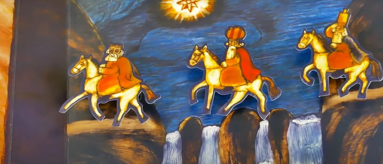 Тифлокомментарий: цветная фотография. Крупным планом страница тактильной книги «Рождество». Три плоские картонные фигурки волхвов с седыми бородами, в красных плащах верхом на желтых лошадях, переходят реку вброд. В ночном синем небе над ними сияет восьмиконечная желтая звезда.