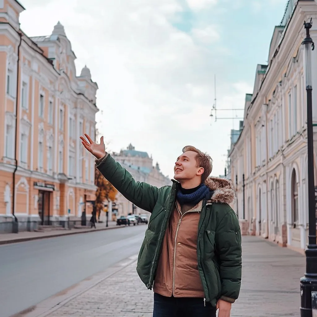 Тифлокомментарий: цветная фотография. Пасмурный осенний день. Молодой русый мужчина стоит на пустынной городской улице с историческими зданиями, с воодушевлением поднимаем руку вверх, широко улыбается. На нем синий свитер, коричневый утепленный жилет и зеленый пуховик нараспашку.