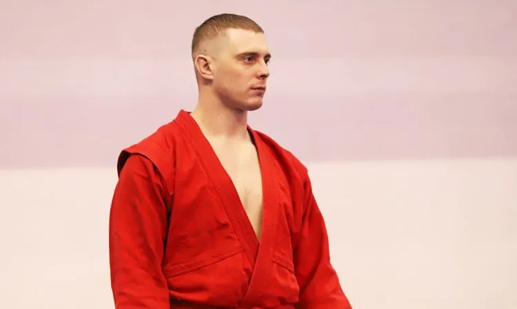 Тифлокомментарий: цветная фотография. На бежевом фоне молодой крепкий спортсмен в красной самбовке. Это Павел Селиванов. У него коротко стриженные русые волосы, выбритые на висках, правильные черты лица, спокойный уверенный взгляд.