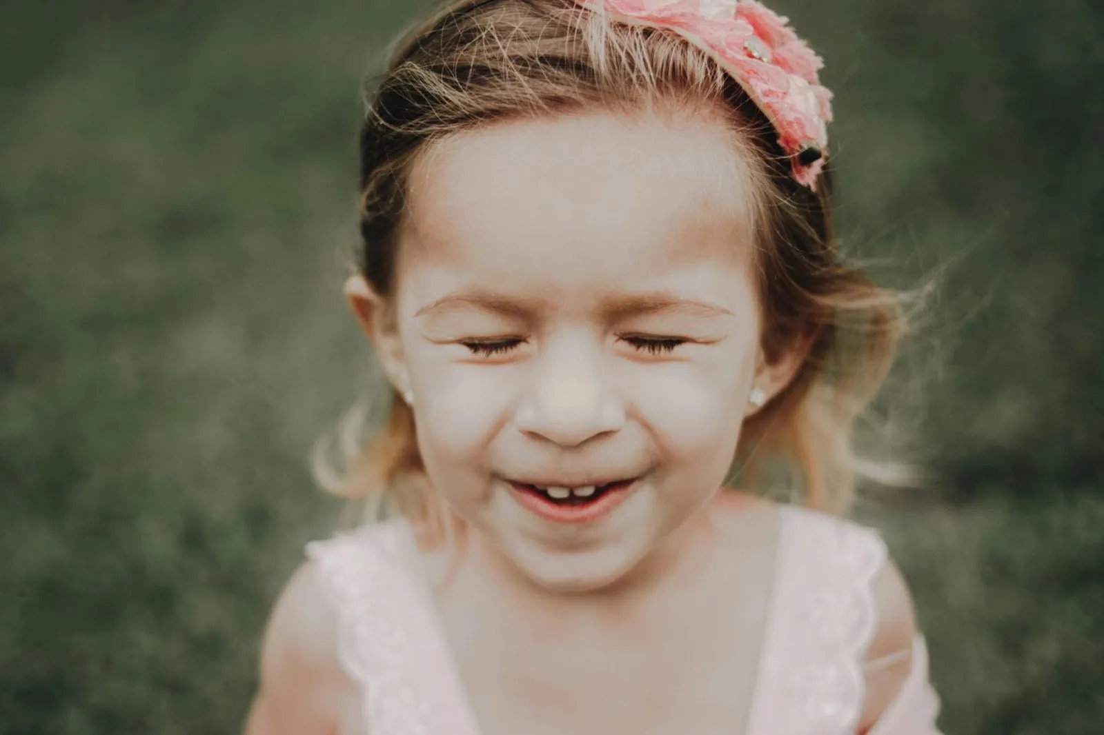 Тифлокомментарий: цветная фотография. На размытом сером фоне крупный план русоволосой девочки лет четырех в кружевном розовом сарафане. На ее голове — розовая заколка в виде цветка, в ушах блестящие сережки-гвоздики. Девочка зажмурилась, широко улыбается.