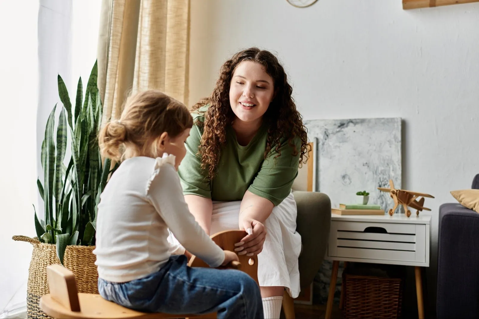 Тифлокомментарий: цветная фотография. Светлая комната с лаконичной мебелью и плетеными корзинами. На деревянной лошадке-качалке сидит девочка лет трех, крепко держится за ручки игрушки. Девочка одета в джинсы и розовую кофточку, ее светлые волосы убраны в пучок на затылке. Напротив нее сидит женщина плотного телосложения с темными вьющимися волосами в зеленом джемпере и белой юбке. Она широко улыбается, поддерживает девочку.