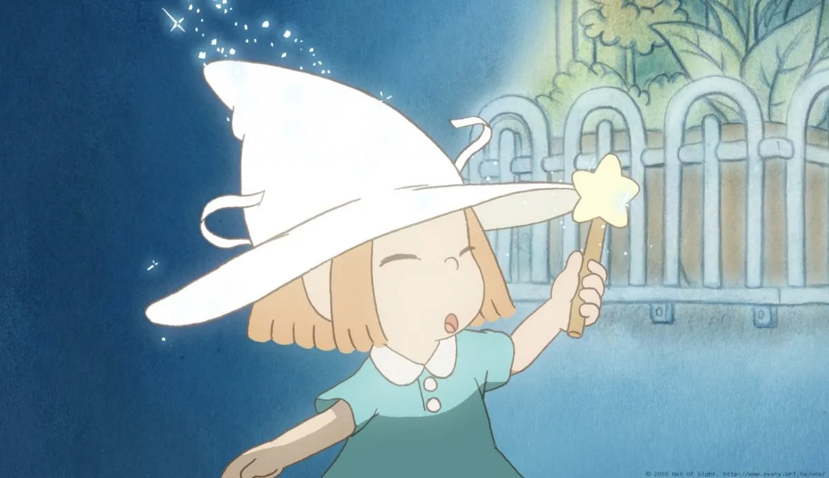 Тифлокомментарий: кадр из мультфильма «Вне поля зрения». На голубом фоне у металлической ограды стоит главная героиня мультфильма — незрячая девочка в голубом платье и белой остроконечной широкополой шляпе как у волшебницы. Ее глаза закрыты. Она взмахивает палочкой со звездочкой на конце.