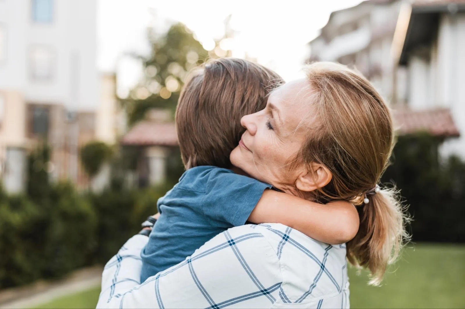 Тифлокомментарий: цветная фотография. На размытом фоне городского пейзажа худощавая женщина средних лет в светлой блузке обнимает маленького темноволосого мальчика в синей футболке. Она держит его на руках, прижимает к себе, закрыв глаза, слегка улыбается. Он обвивает руками ее шею.