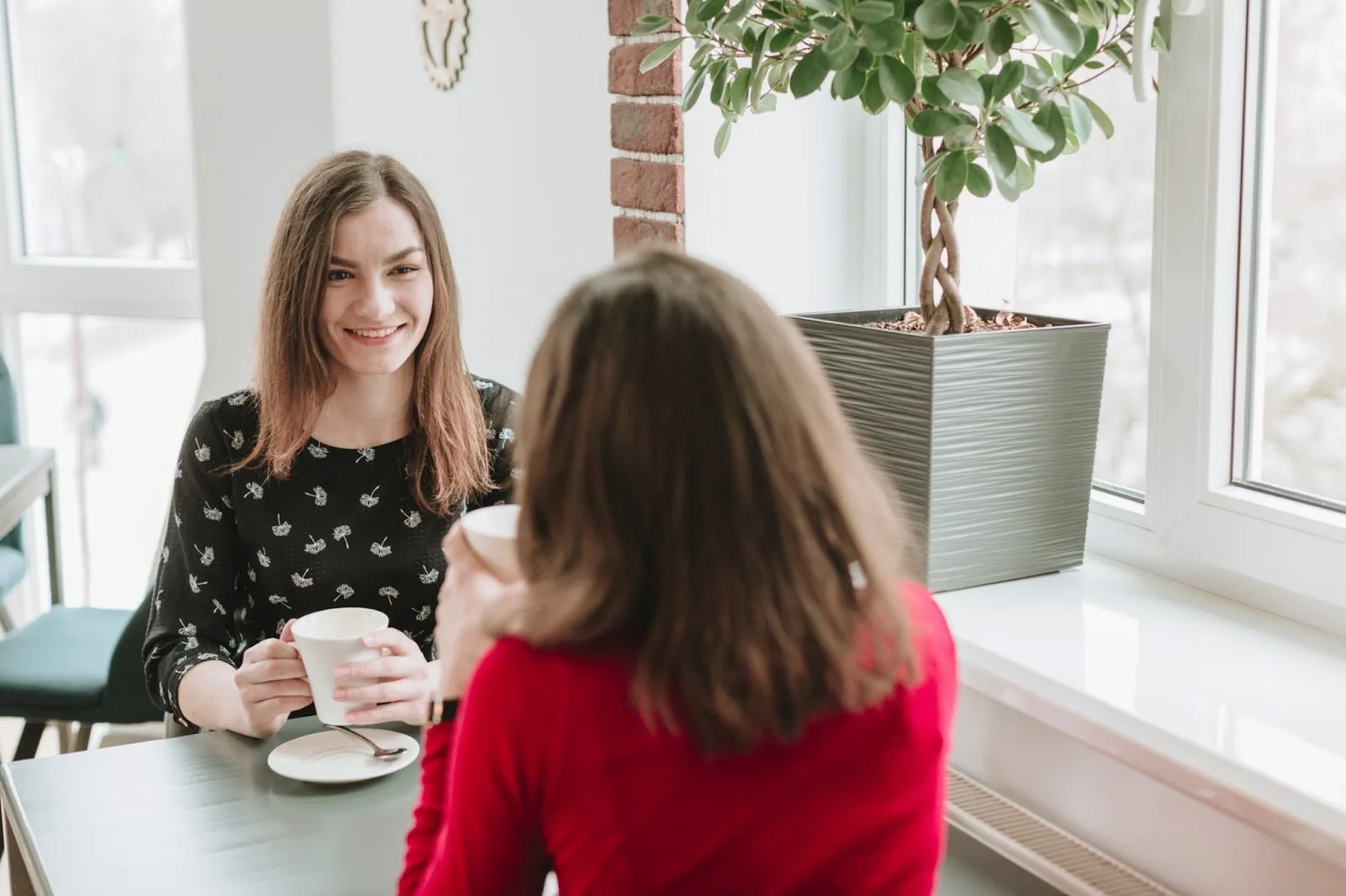 Тифлокомментарий: цветная фотография. Светлое кафе с простым интерьером, белыми стенами и частью кирпичной кладки. Две девушки с длинными русыми волосами сидят за маленьким столиком у окна, пьют кофе из высоких белых кружек, разговаривают. Одна из них, в красном джемпере, сидит к нам спиной. Ее собеседница в черной блузке с принтом, она широко улыбается.