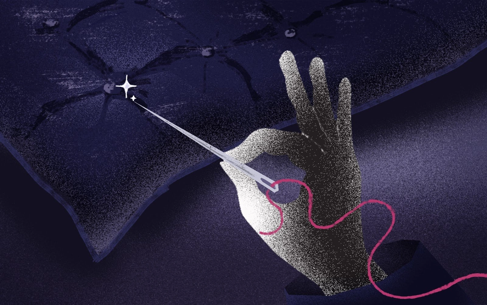 Тифлокомментарий: швейной иглой кто-то осторожно прикасается к фиолетовому стеганому одеялу. Легко держит ее большим и указательным пальцами правой руки. От иголки вьется розовая нить. В месте соприкосновения сияет небольшая белая звезда.