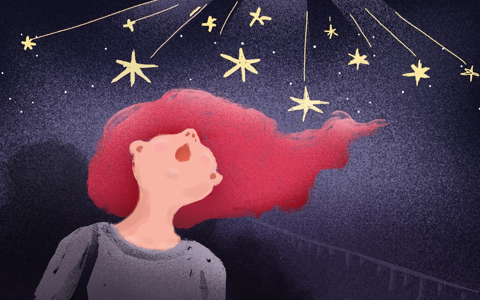 Тифлокомментарий: на фиолетовом фоне стоит девушка с ярко-розовыми волосами, которые развеваются на ветру. Она, открыв рот, смотрит в небо. Сверху падают желтые звезды, оставляя за собой длинные следы.
